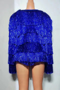Shimmering under stage lights and designed to turn every head, this Sparkly Blue Rhinestones Tassels Bodysuit is the perfect fusion of glamour and performance-ready practicality. Crafted for singers, dancers, nightclub performers, and models, the bodysuit features a vivid, electric-blue base fabric with a glossy, stretch finish that hugs the body’s contours for a flattering, second-skin fit. The entire front and select back panels are densely embellished with multi-sized crystal rhinestones that catch and reflect light from every angle, creating a dazzling visual effect during spins, lifts, and close-up shots.
