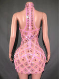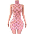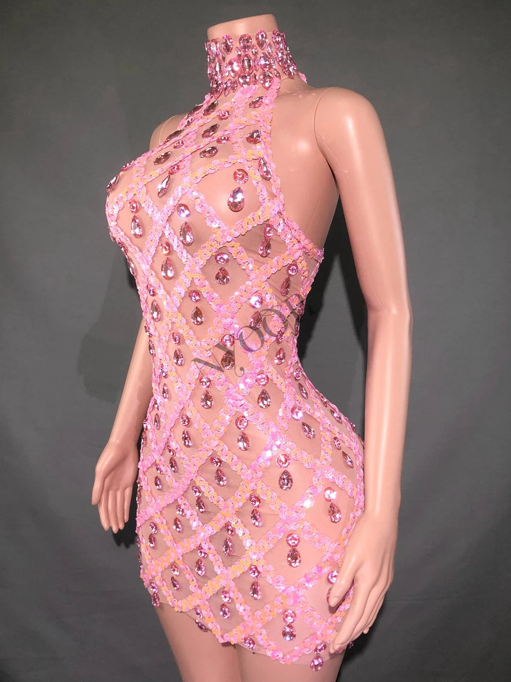 Sparkly Pink Rhinestones Short Dress for Women Sexy Sleeveless Mesh Transparent Evening Prom Birthday Dress Singer Stage Wear