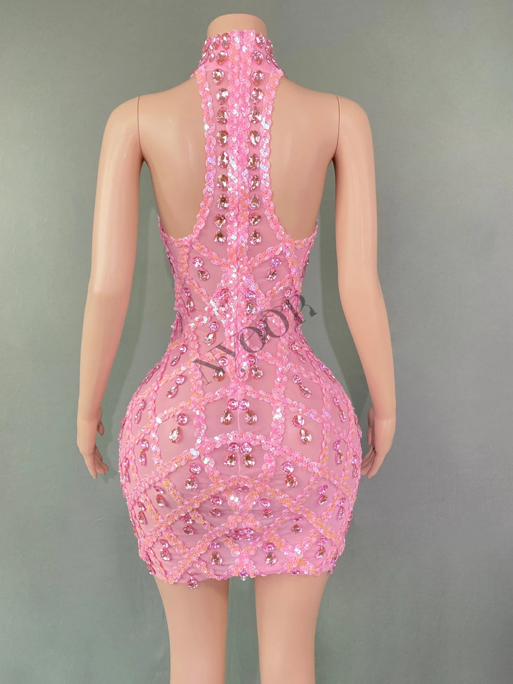 Sparkly Pink Rhinestones Short Dress for Women Sexy Sleeveless Mesh Transparent Evening Prom Birthday Dress Singer Stage Wear