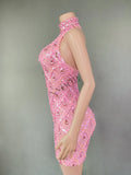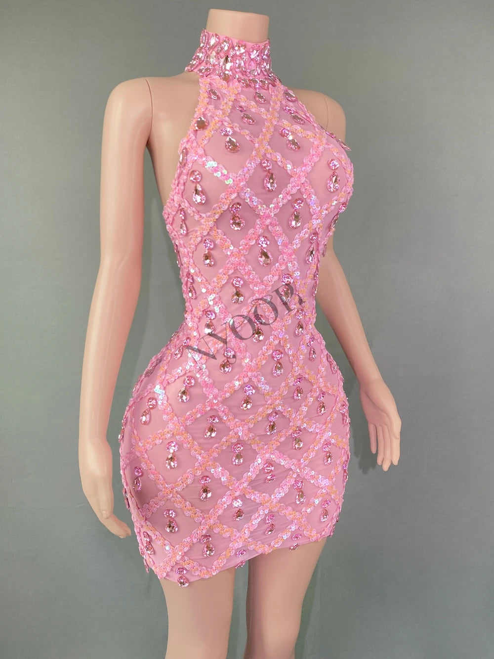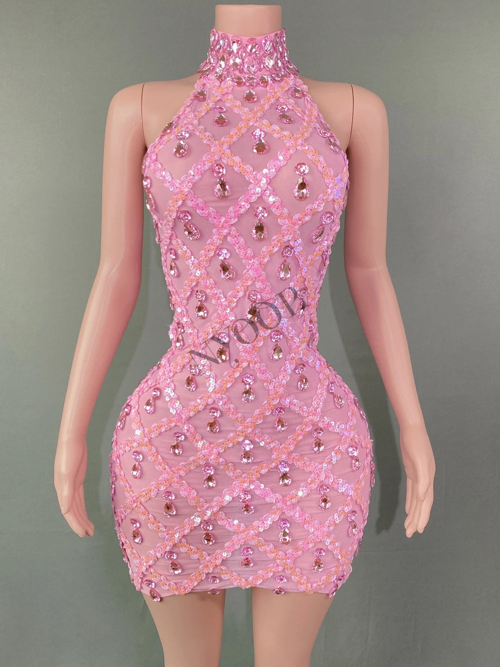 Turn heads and shine all night in this dazzling sparkly pink dress, adorned with shimmering rhinestones. Designed for women who appreciate bold glamour, this sexy, sleeveless short dress features a mesh transparent overlay that exudes confidence and elegance. Perfect for evening events, proms, birthdays, or taking the stage as a singer or performer, this show-stopping dress ensures you’ll stand out in any crowd.