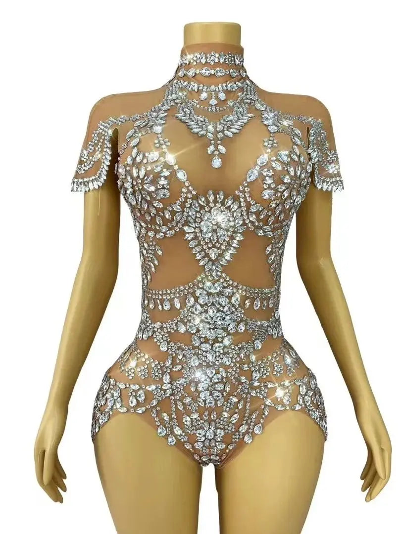 Shine bright on stage or at the club in this Sparkly Rhinestones Bodysuit for women. Crafted from transparent mesh and embellished with dazzling rhinestones, this sexy outfit hugs your curves and makes you the center of attention. Perfect for nightclub performances, dance costumes, singer showcases, or any event where you want all eyes on you, this bold stage wear adds a touch of glamour and excitement to every move.