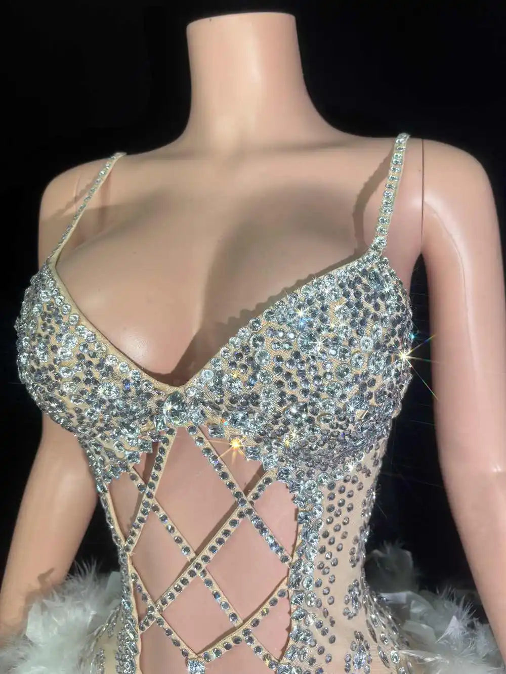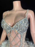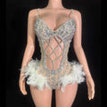 Sparkly Rhinestones Feathers Bodysuit for Women Sexy Hollow Slip Performance Dance Costume Singer Dancer Stage Wear Party Outfit