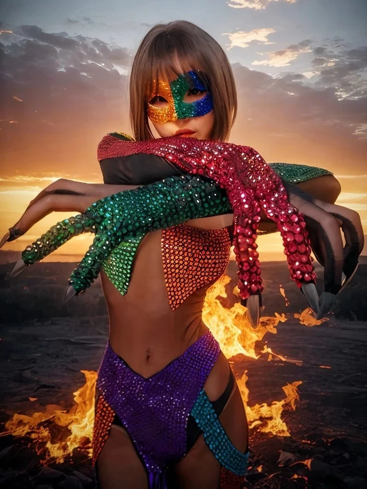 Elevate your stage presence with a dazzling Sparkly Rhinestones Jumpsuit — a body‑skimming, mesh‑transparent one‑piece designed for nightclub appearances, birthday parties, runway moments, and high‑energy stage performances. This jumpsuit combines sheer stretch mesh, dense rhinestone embellishment, and performance‑grade construction so you can move confidently while catching every light.