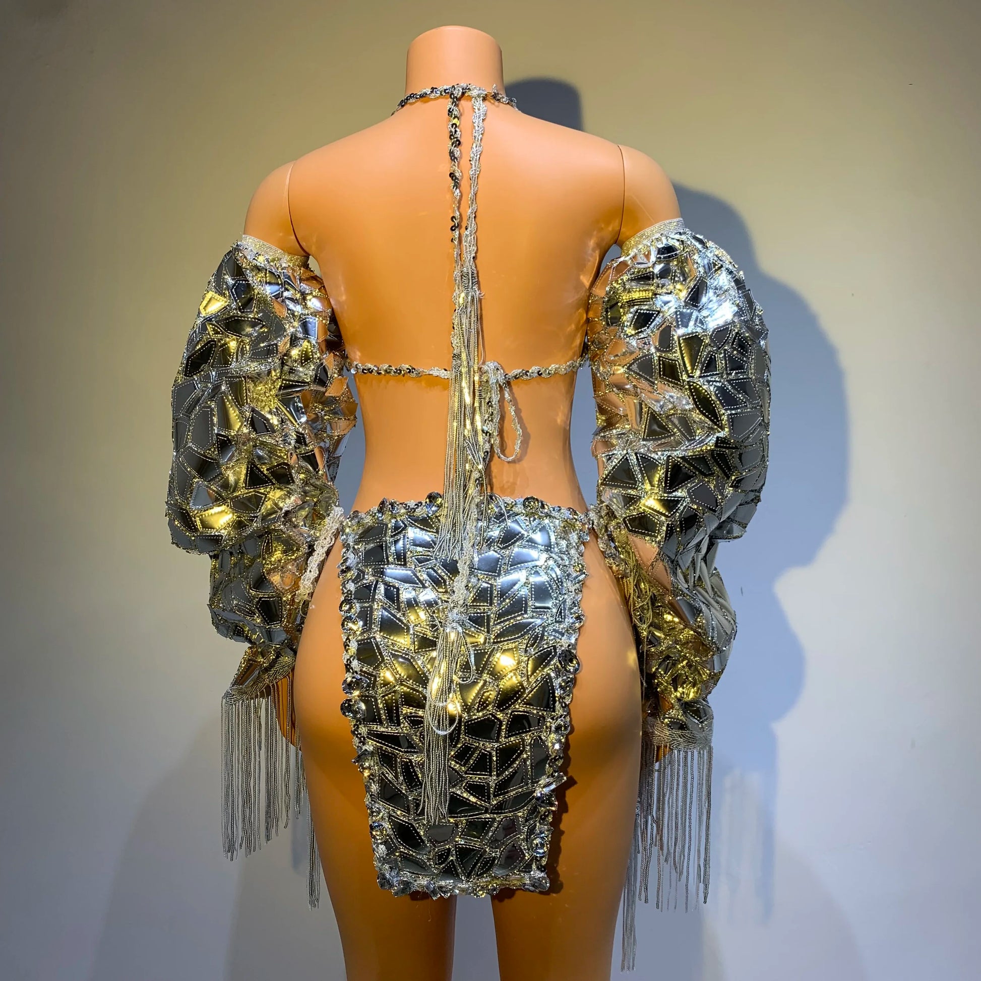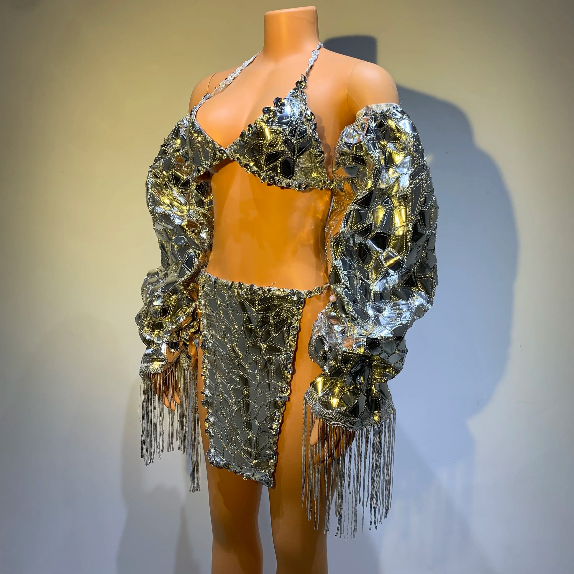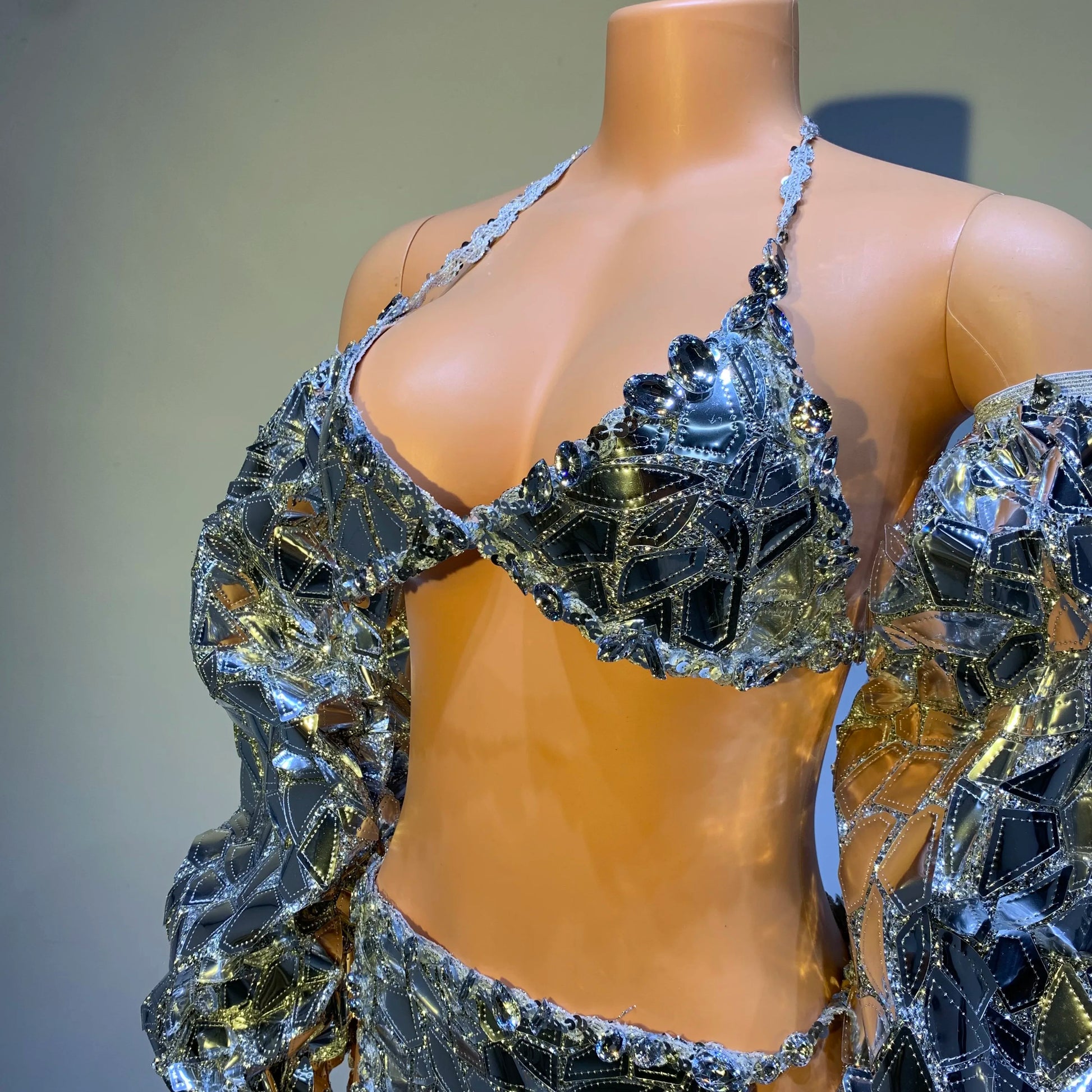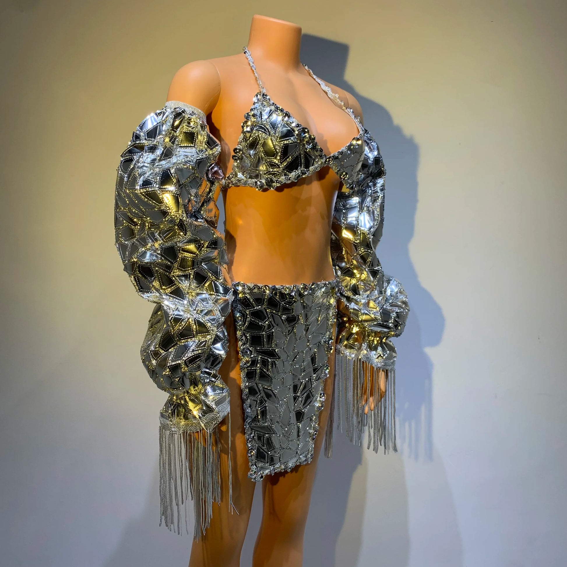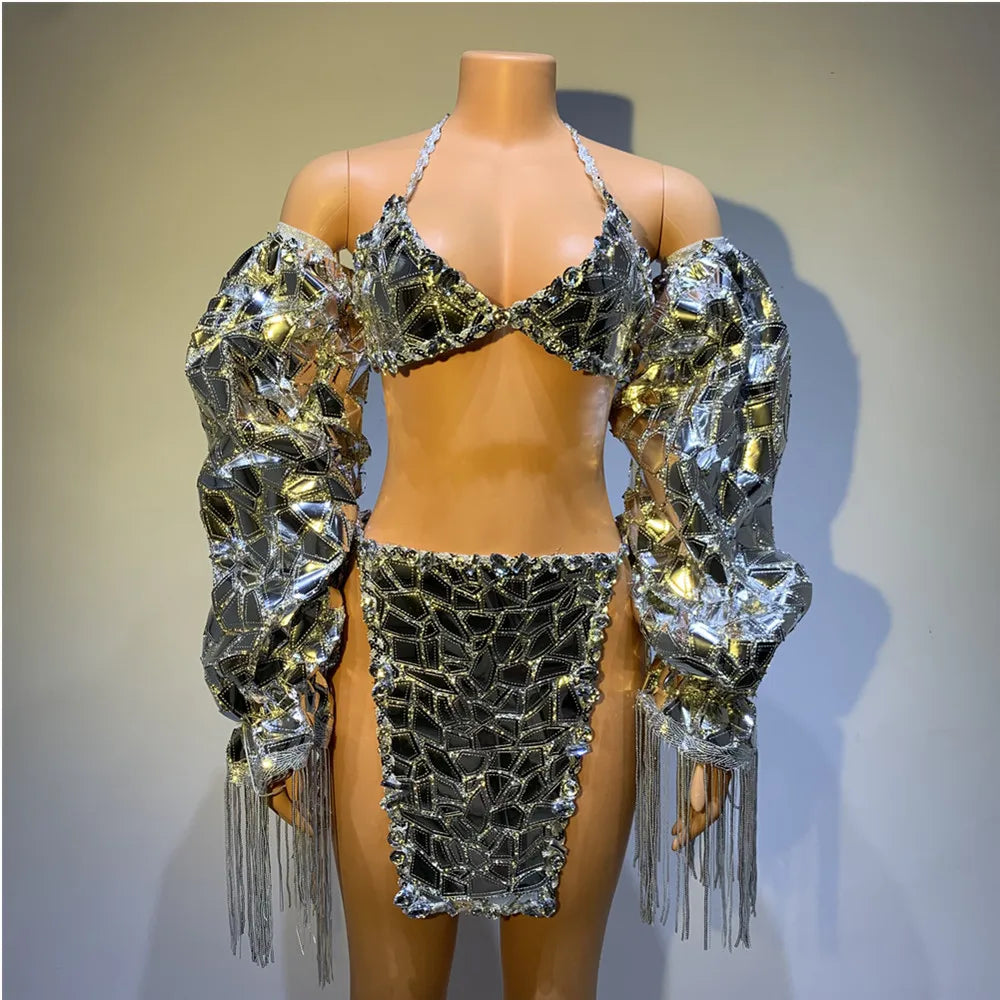 Shine brighter than the spotlight in this dazzling sequined halter top and short bikini skirt suit—designed for women who want to make a bold, glamorous statement at parties, birthdays, dances, or on stage. The halter top features a flattering neckline that ties or fastens behind the neck to showcase shoulders and back, while the cropped, form-fitting cut highlights the waist and accentuates the torso. Covered in high-gloss sequins, the top catches and reflects light from every angle to create an eye-catching, flash-ready effect perfect for performance and nightlife.