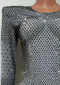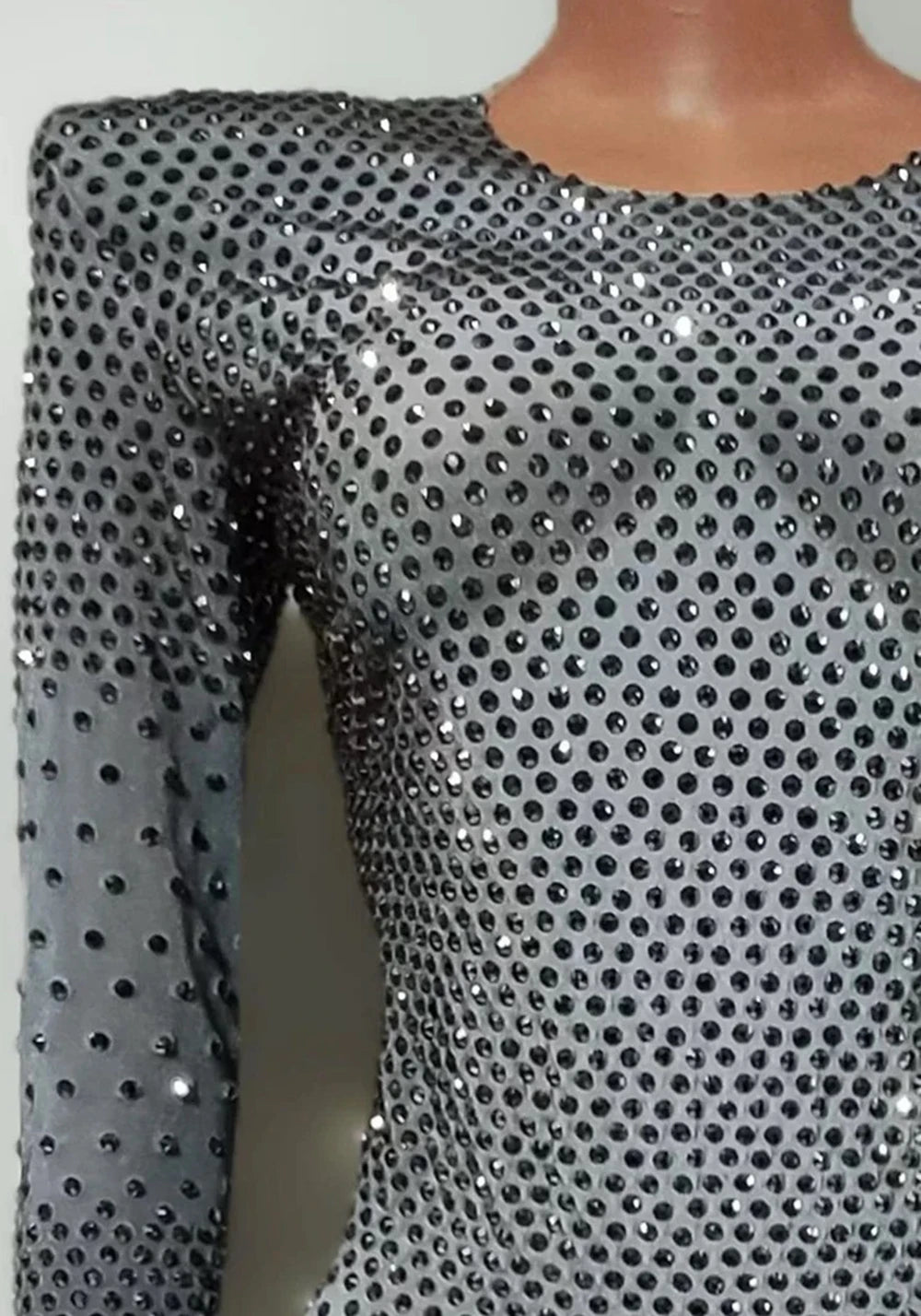 Shine on stage in this sparkly silver rhinestone bodysuit, designed to make you the center of attention. Featuring glamorous long sleeves and a sleek, sexy fit, this performance dance costume is perfect for dancers, show performers, or anyone craving a striking nightclub look. The dazzling rhinestone details catch the light beautifully, while the stretch fabric moves with you for comfort during every performance. Elevate your stage presence and own the spotlight in this unforgettable, show-ready outfit!