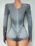 Sparkly Silver Rhinestones Long Sleeve Bodysuit for Women Sexy Performance Dance Costume Dancer Show Stage Wear Nightclub Outfit