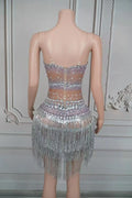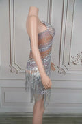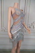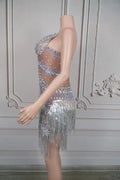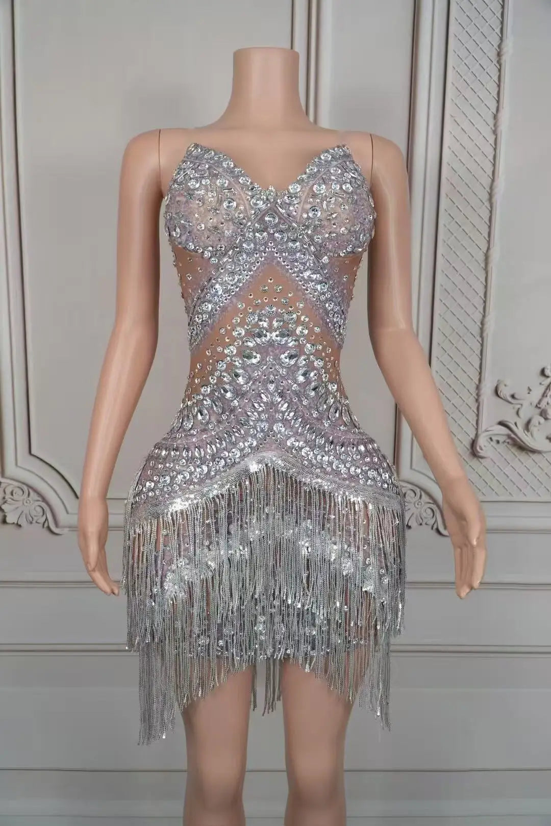 Sparkly Silver Rhinestones Mesh See Through Tassels Suspender Dress Women Sexy Celebrate Birthday Wedding Evening Prom Dress