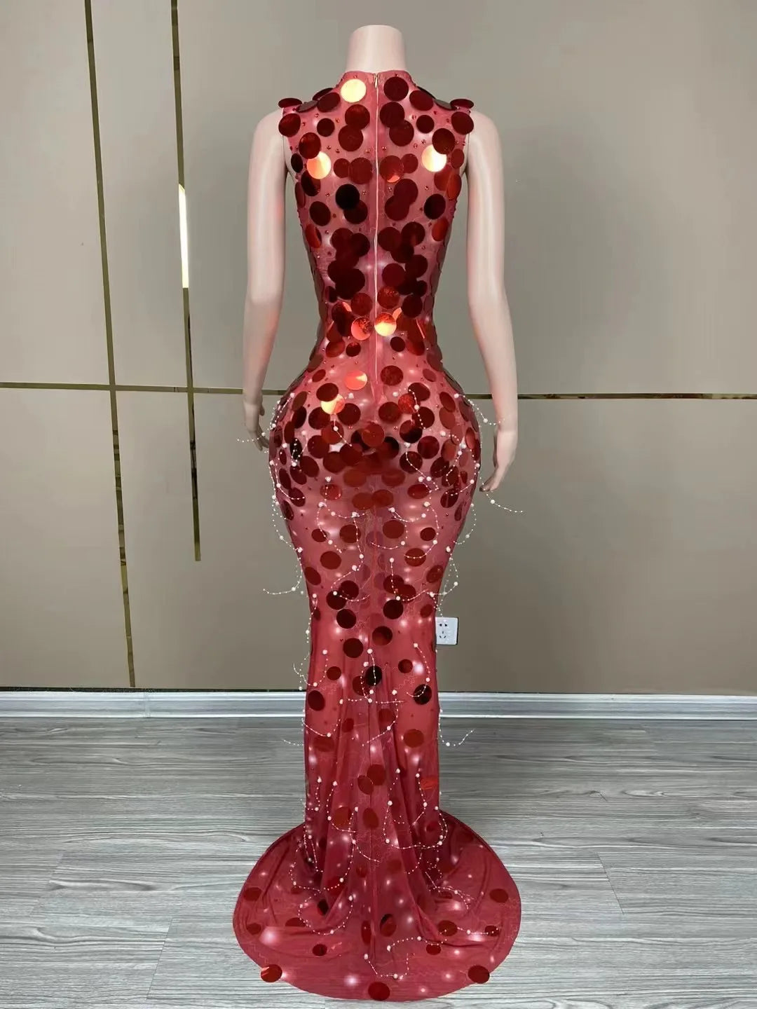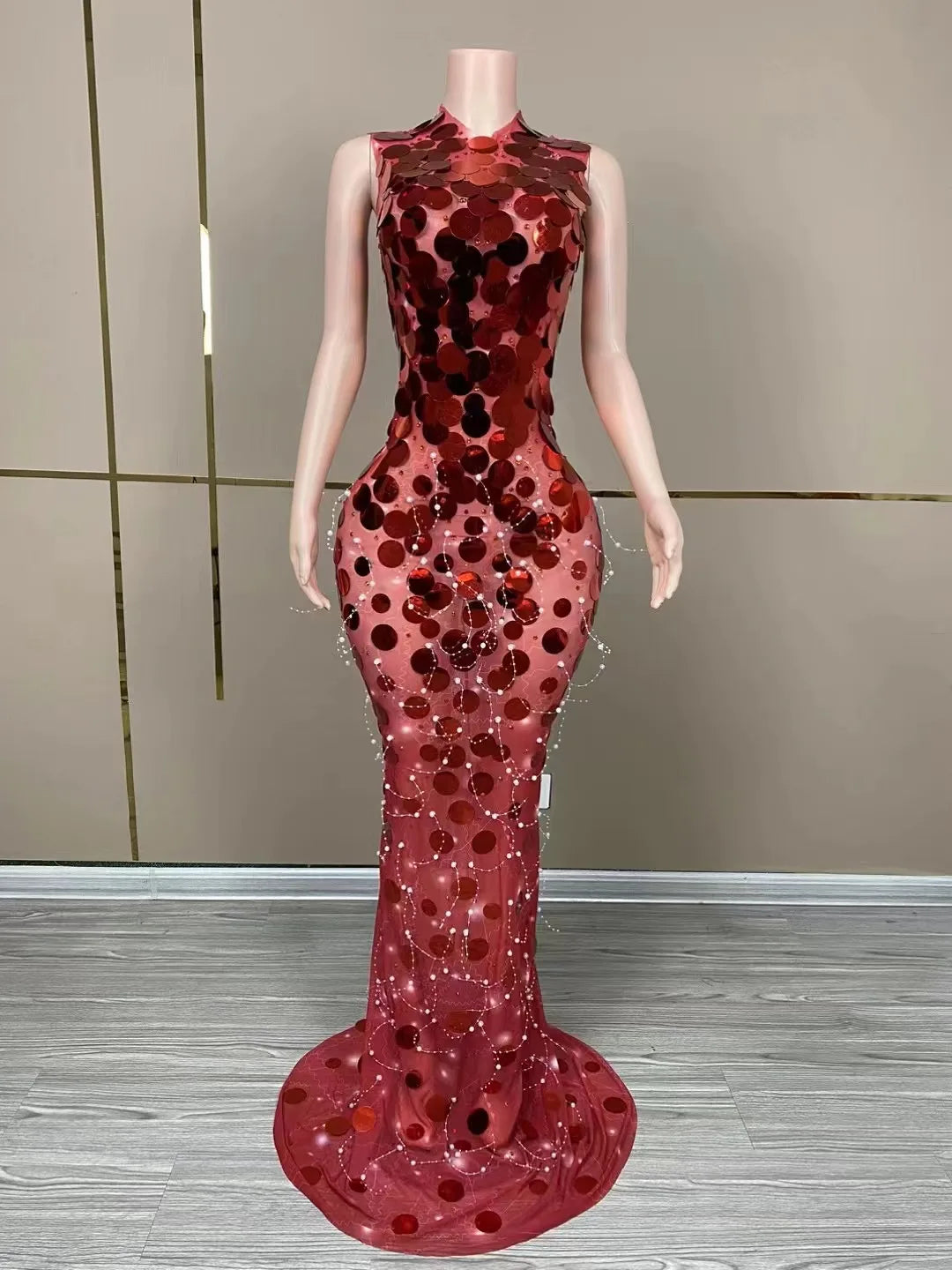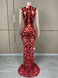 Sparkly Sleeveless Floor Length Round Sequins Dress Women Singer Birthday Evening Prom Outfit Red Photoshoot Dress