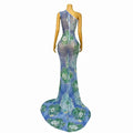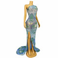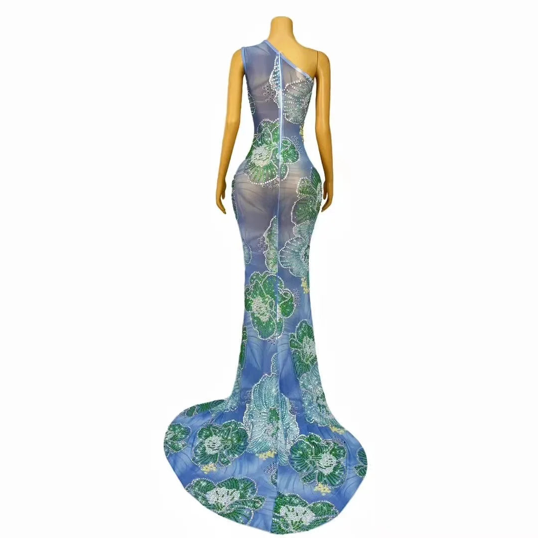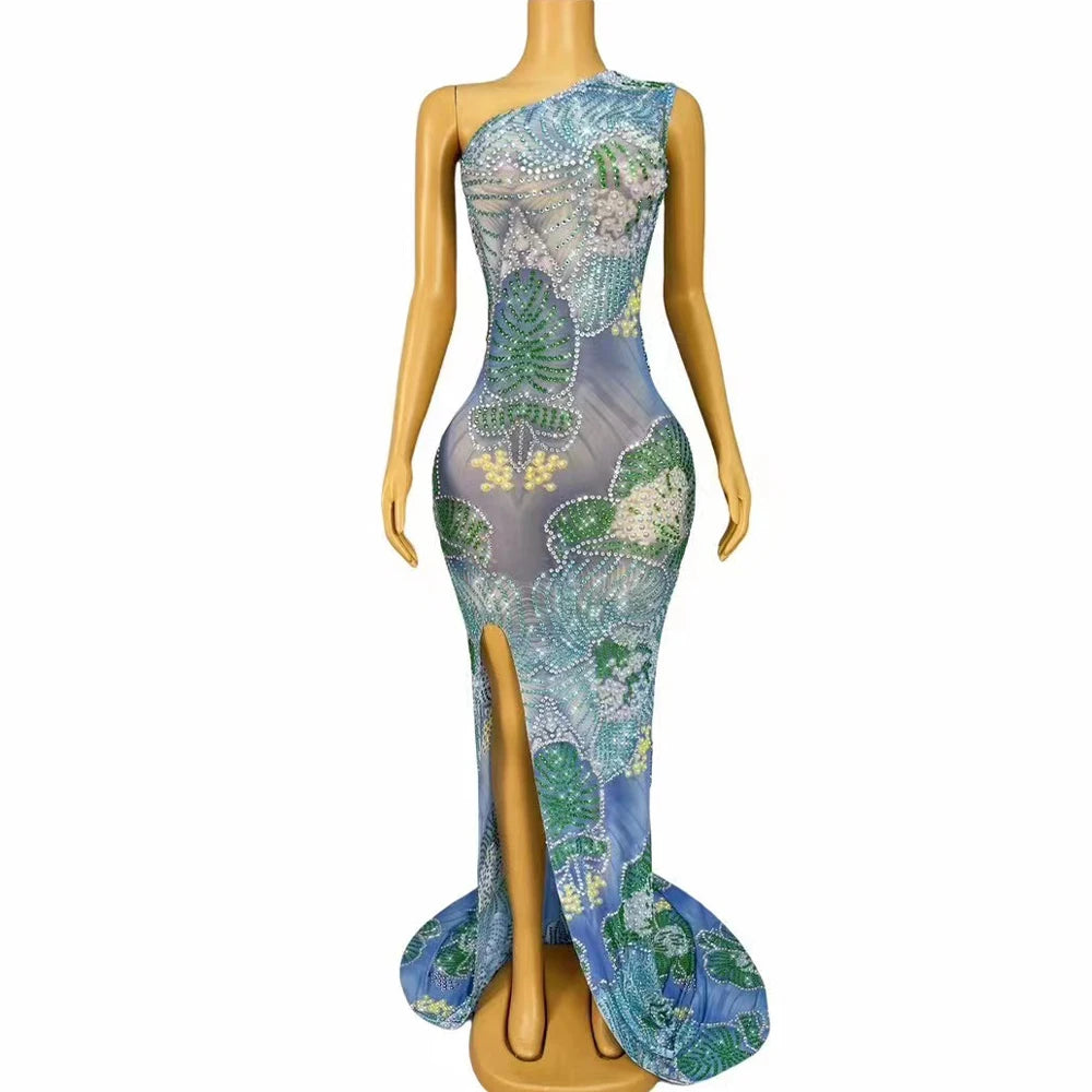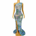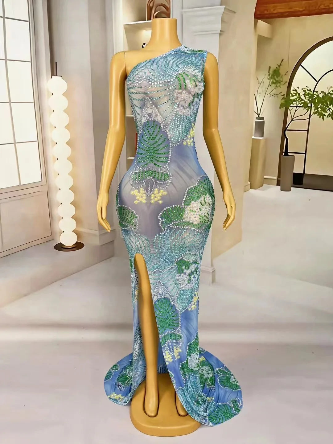 Special Shiny Rhinestones Pearls One Shoulder Trailing Dress High Split Women Elegant Party Evening Celebrate Photoshoot Costume
