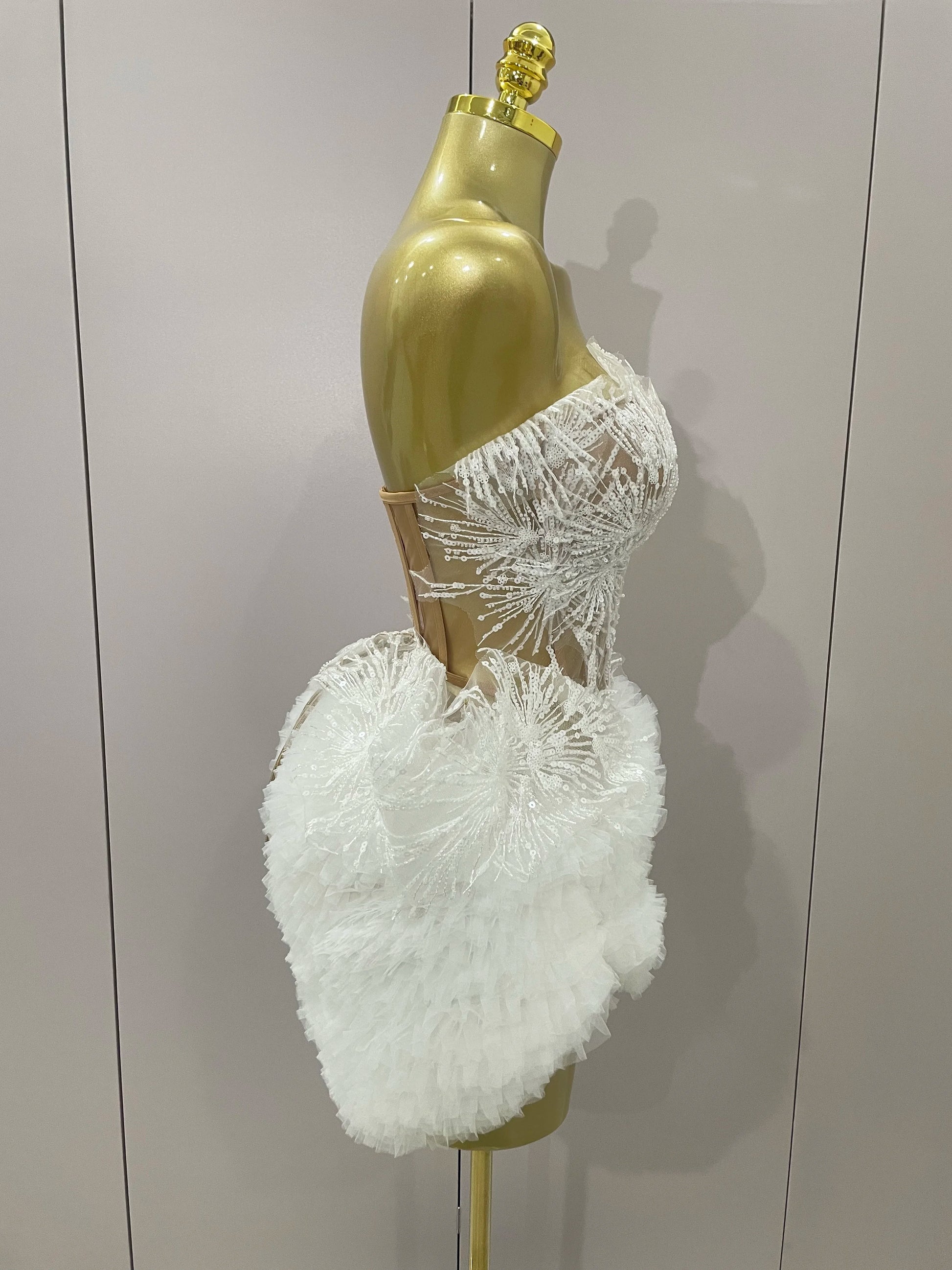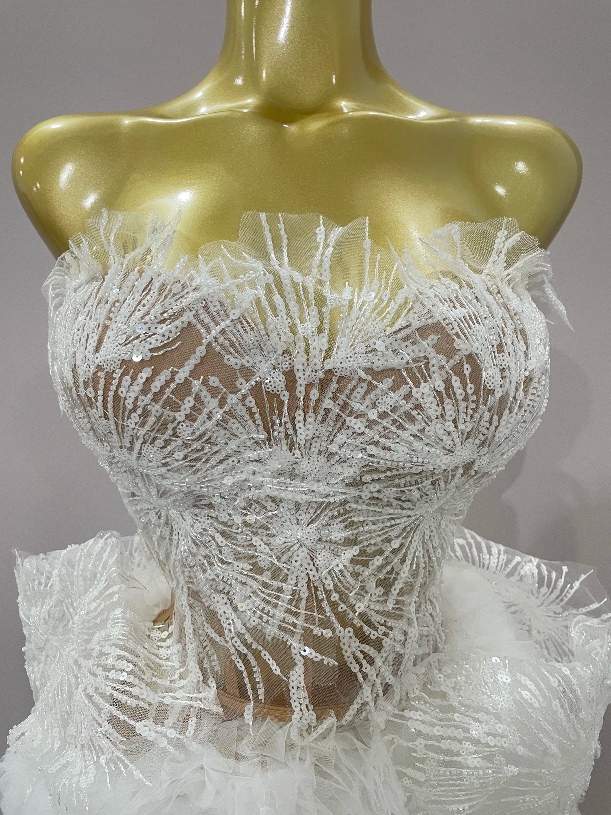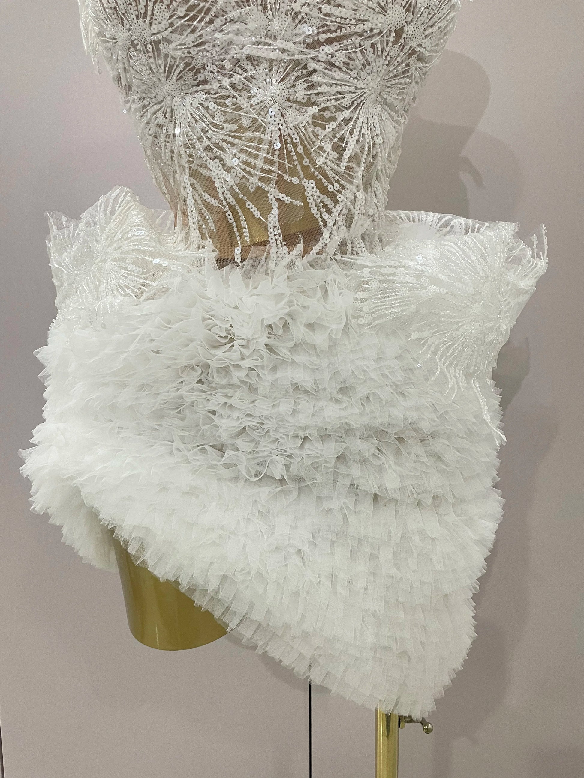 Elevate your stage presence and nightlife look with this Stock Sexy White Lace Strapless Top and Ruffles Mini Skirt 2‑piece set — designed for singers, dancers, performers, and partygoers who want a blend of flirtatious charm and performance-ready functionality. Crafted with attention to silhouette, comfort, and eye-catching detail, this set is a versatile wardrobe staple for evening events, nightclub appearances, birthdays, and choreographed stage routines.