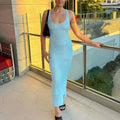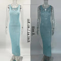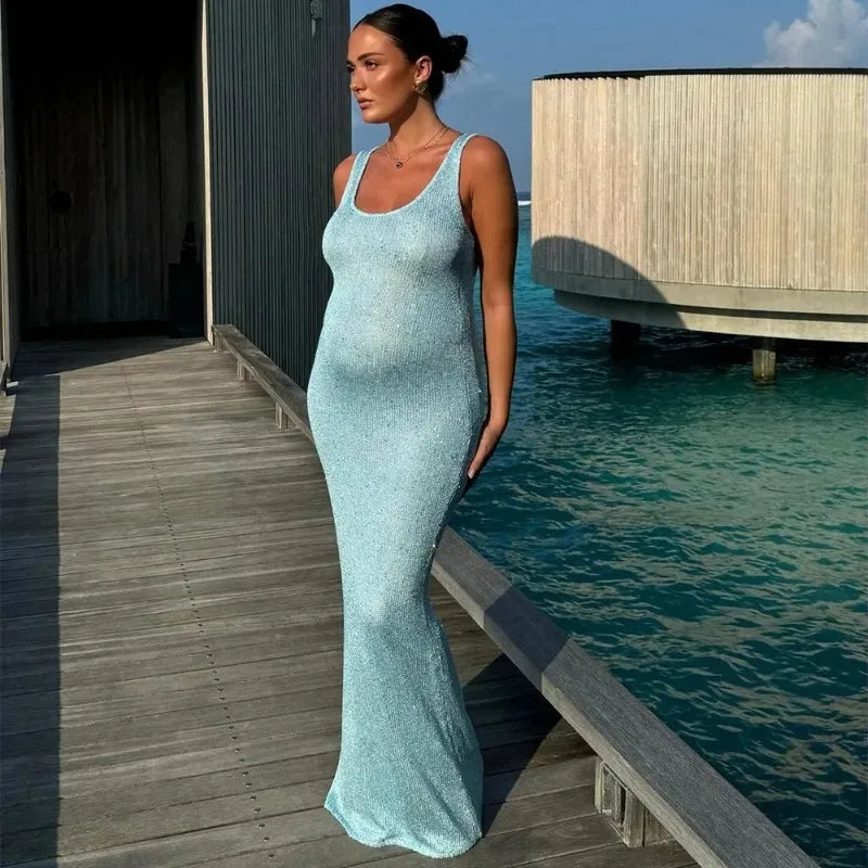 Sequin Off Shoulder Slim Maxi Dress Women's Sexy Sleeveless Glitter Dress Summer See-through Party Backless Slim Dress