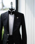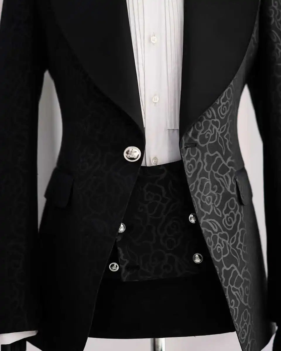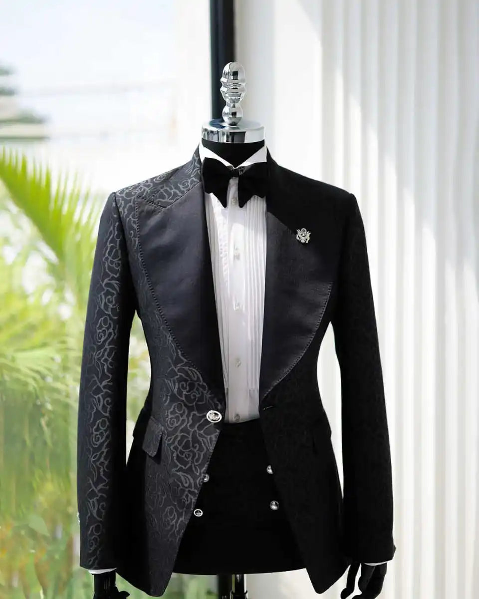 Capture timeless elegance with this Vintage Jacquard Wedding Suit for the groom, a single-breasted two-piece tuxedo crafted to evoke classic refinement with contemporary comfort. The jacket’s vintage-inspired jacquard fabric features a rich, woven pattern—think subtle baroque florals, intricate paisleys, or refined geometric motifs—that catches light softly and adds depth without overwhelming the silhouette. A sharply tailored peaked lapel lends a dignified, sartorial edge that elongates the torso and frames the face, making it an outstanding choice for wedding portraits, evening events, and formal celebrations.