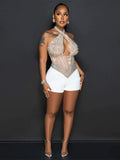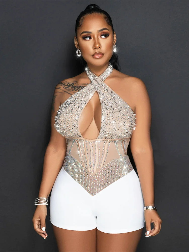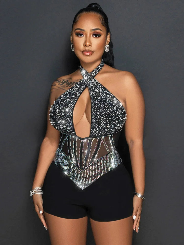 Sequins Halter Women Bodysuit Sparkle Hollow Backless Sleeveless Patchwork Sexy Stage Performance Party Playsuits