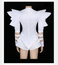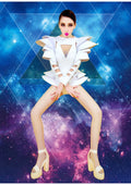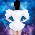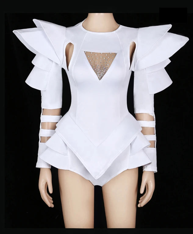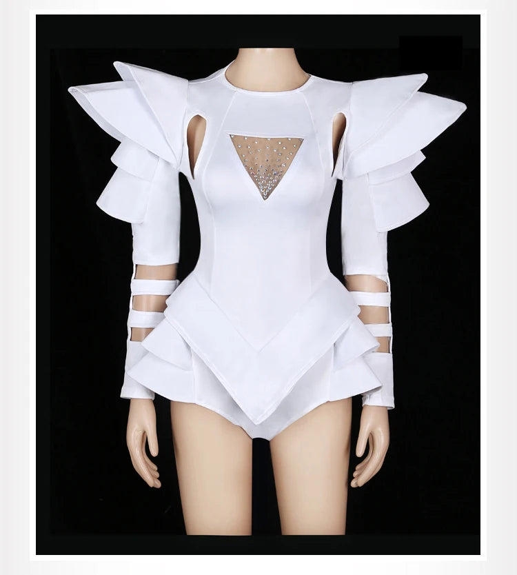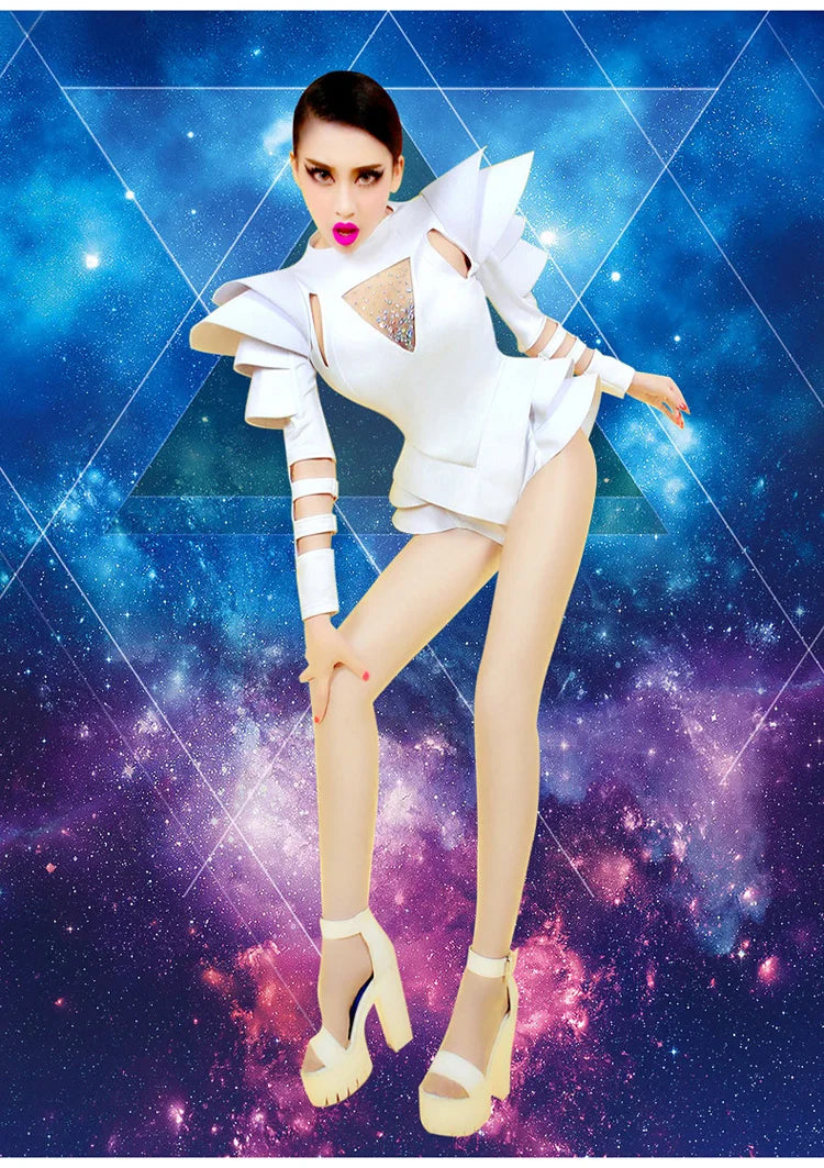 Shine on stage in this dazzling white bodysuit, designed for performers who demand maximum visual impact. Covered in AB (Aurora Borealis) rhinestones that refract light with prism-like color shifts, this piece is perfect for jazz dancers, DJs, singers, hip‑hop performers, and anyone wanting a bold, photo-ready look for birthdays, club nights, or stage events.