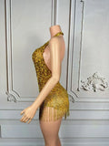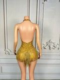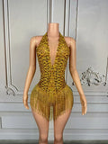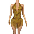 Women Luxury Sparkly Gold Rhinestones Chain Tassel Bodysuit Sexy V Neck Dance Costume Dancer Performance Stage Photoshoot Wear