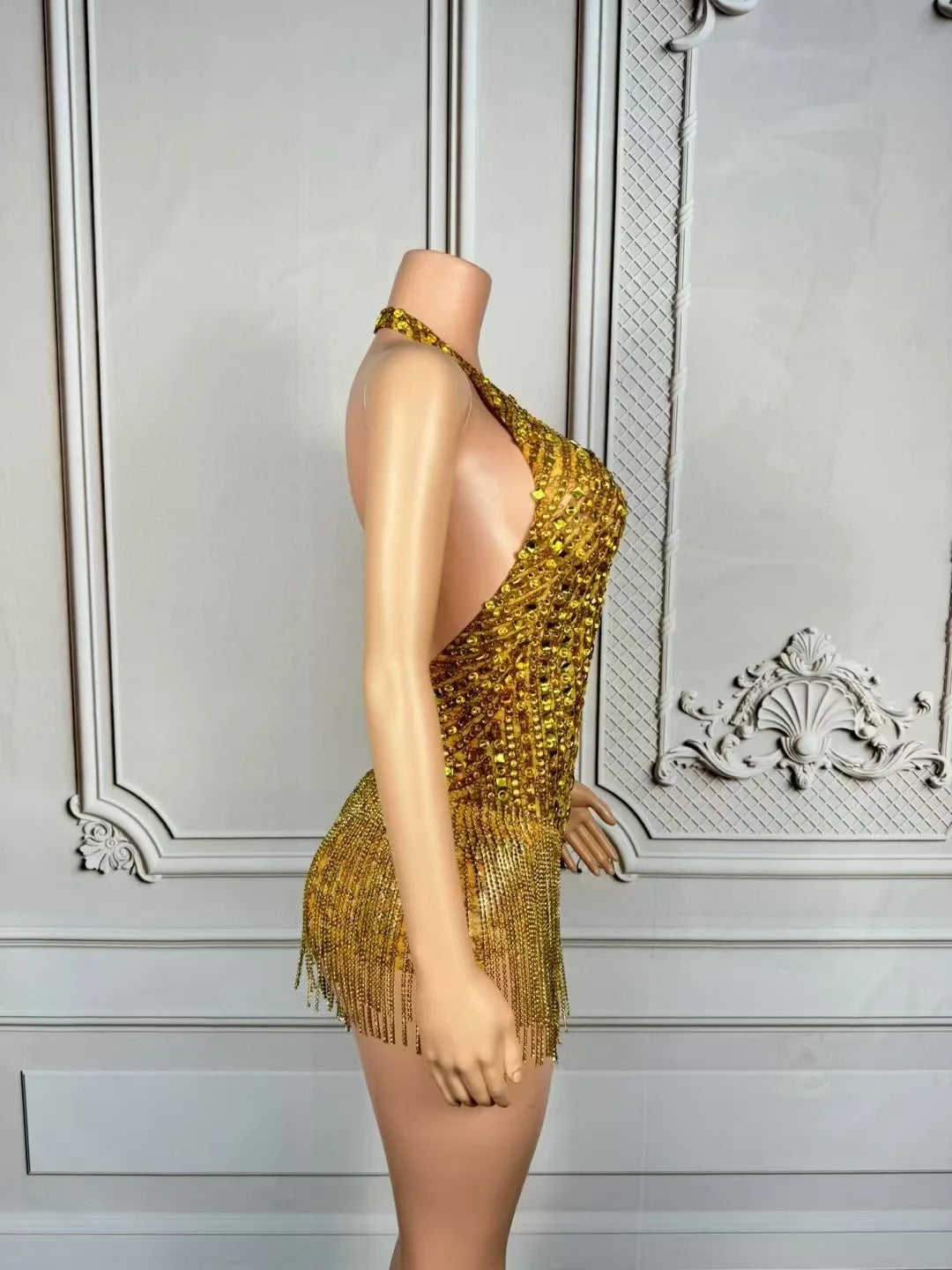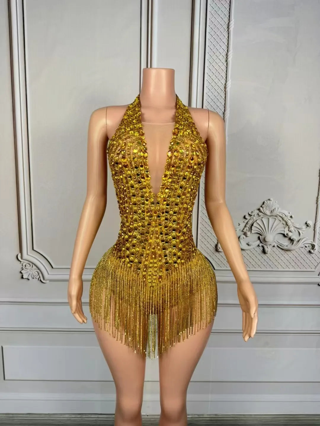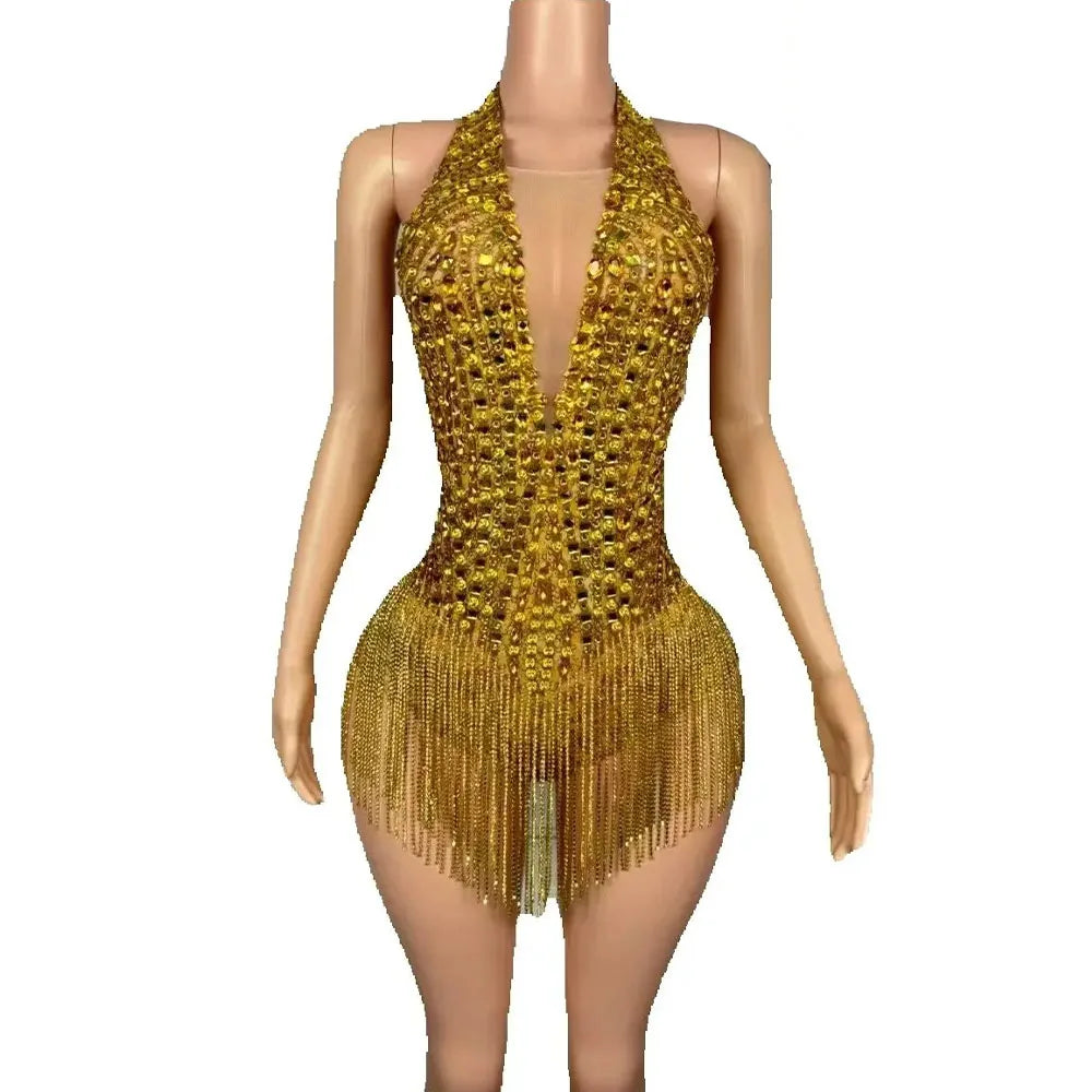 Elevate your stage presence with this Women’s Luxury Sparkly Gold Rhinestones Chain Tassel Bodysuit — a high-impact, glamorous piece designed for dancers, performers, and models who demand drama and polish. With a plunging V-neckline, intricate rhinestone detailing, and moving chain tassels, this bodysuit merges couture sparkle with performance-ready construction so you’ll shine in every spotlight and camera flash.