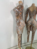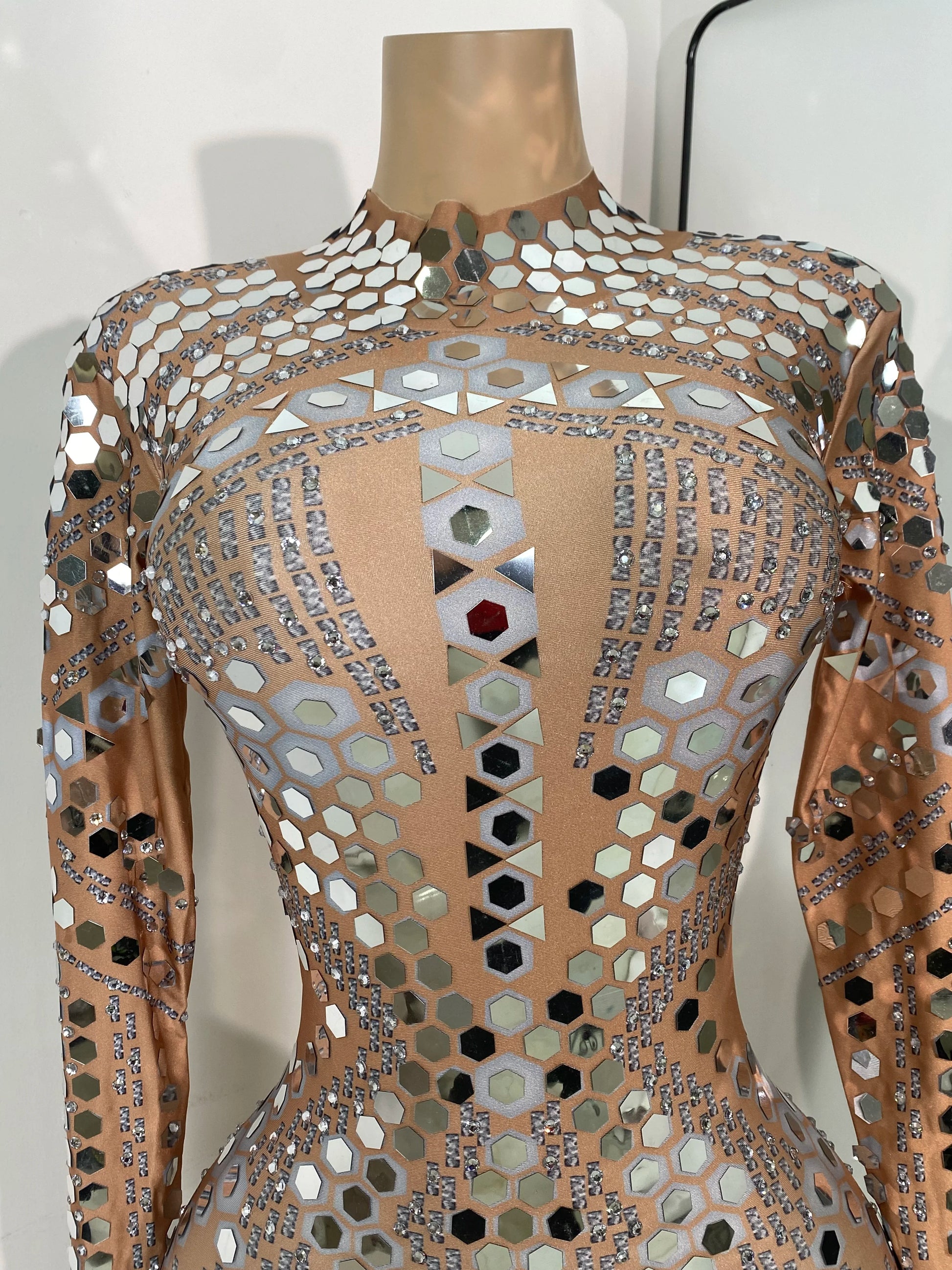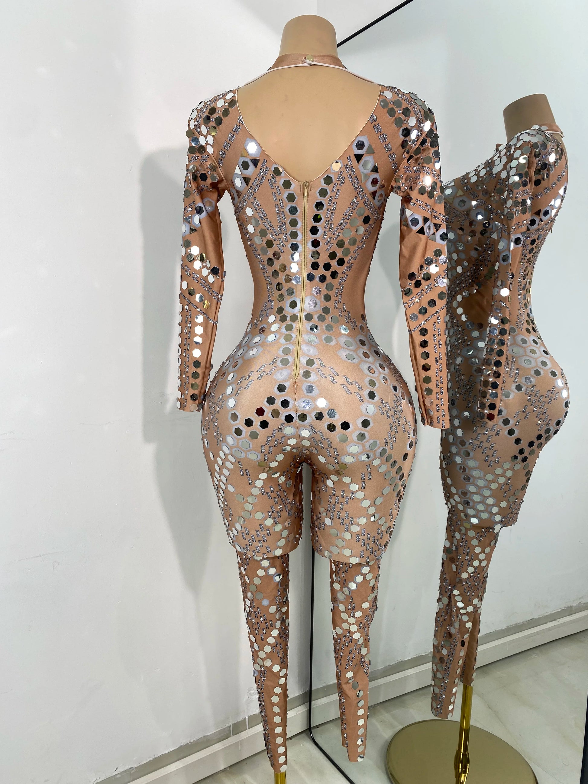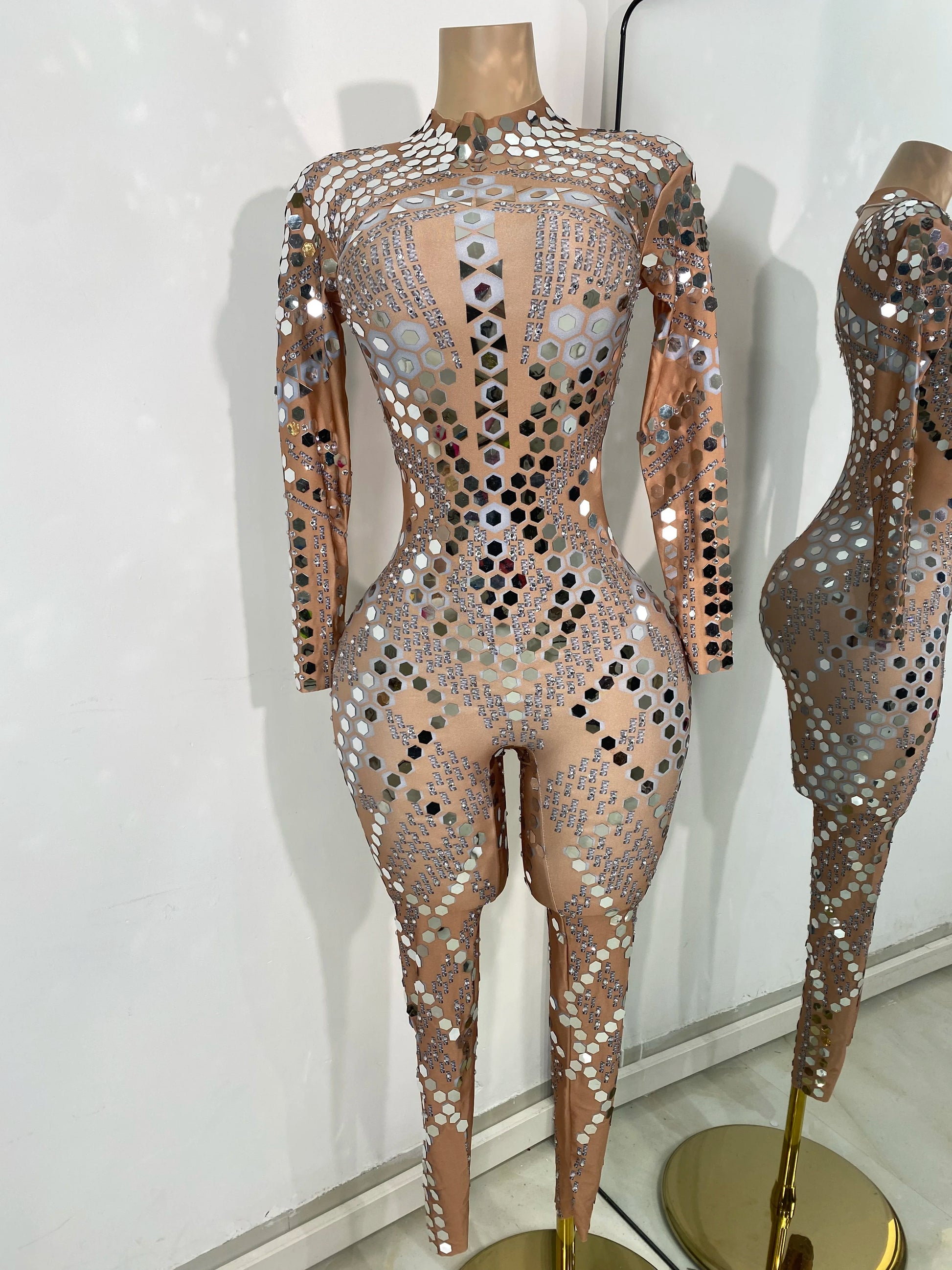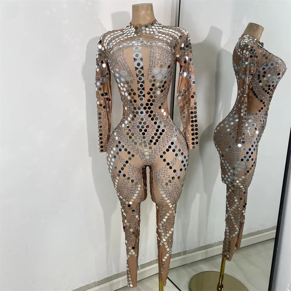 Unleash your inner star with this sexy spandex tight jumpsuit for women. Crafted for maximum stretch and comfort, this long sleeve one-piece features gleaming mirror accents that create a dazzling effect under the lights—perfect for cosplay, nightclub dancers, and stage performances. The body-hugging design enhances your silhouette, while the bold, reflective look ensures all eyes are on you. Step into the spotlight and shine at your next event or performance with this show-stopping jumpsuit.