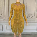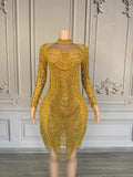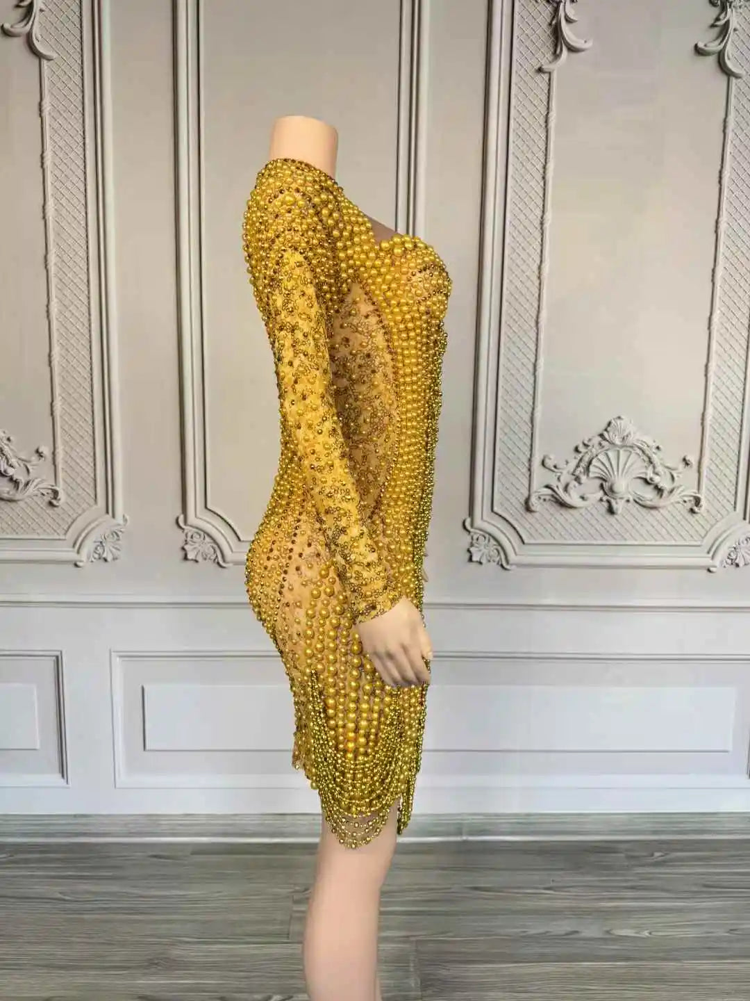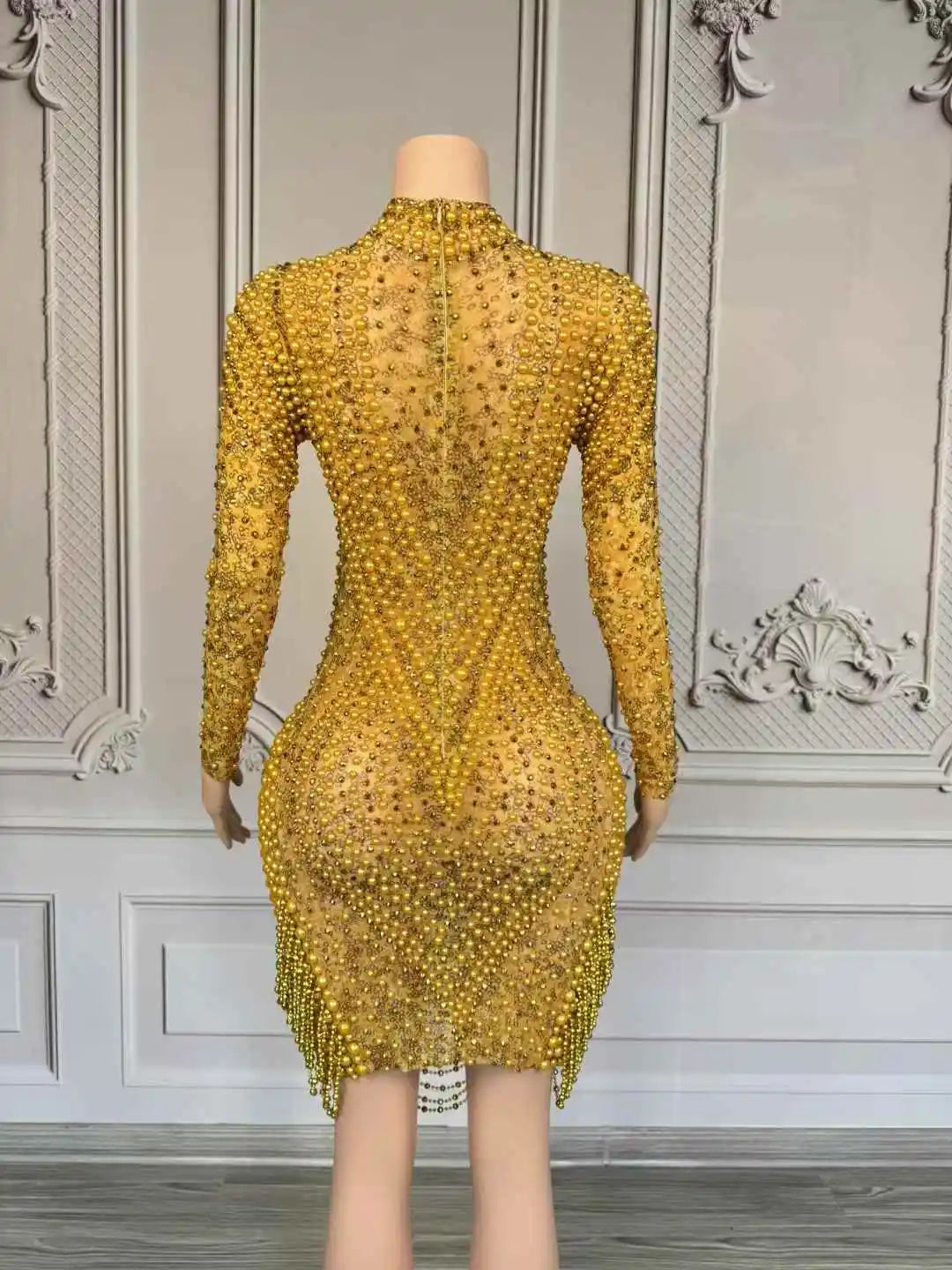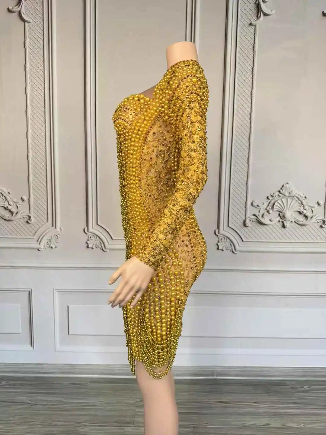 Women Sexy Sparkly Luxury Gold Pearls Dress Birthday Party Festival Party Celebrate Rhinestone Evening Dress Prom Stage Outfit