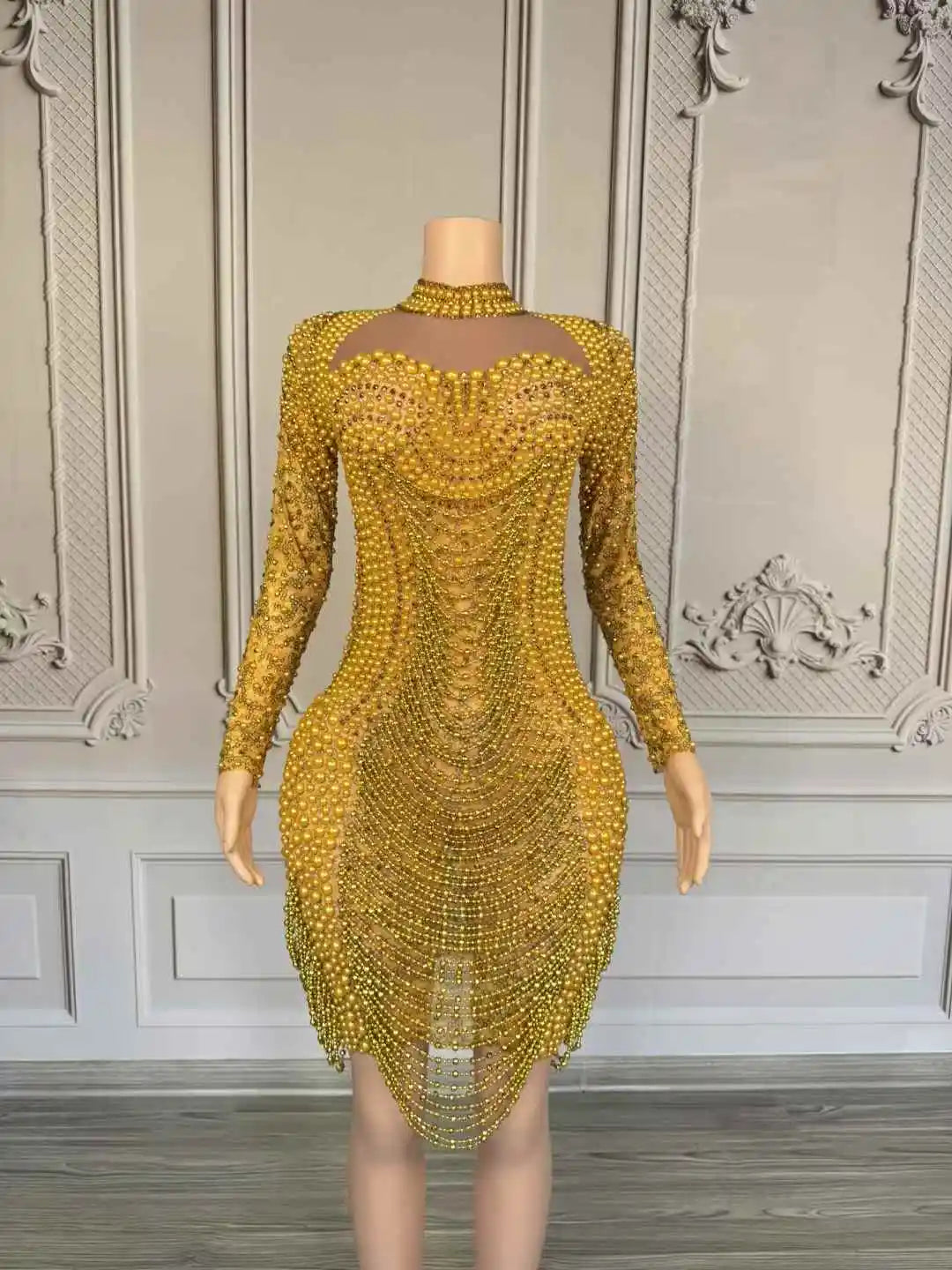 - Make every entrance unforgettable in our Luxury Gold Pearls Dress. Crafted from a shimmering gold fabric, this figure-hugging dress is lavishly accented with pearl appliqués and hand-applied rhinestones that catch light from every angle. The flattering cut sculpts your silhouette while a soft lining ensures comfort for long nights of celebration. Ideal for birthdays, prom, stage performances, and festival appearances, this dress pairs beautifully with metallic heels and bold makeup for high-impact photos and unforgettable moments.