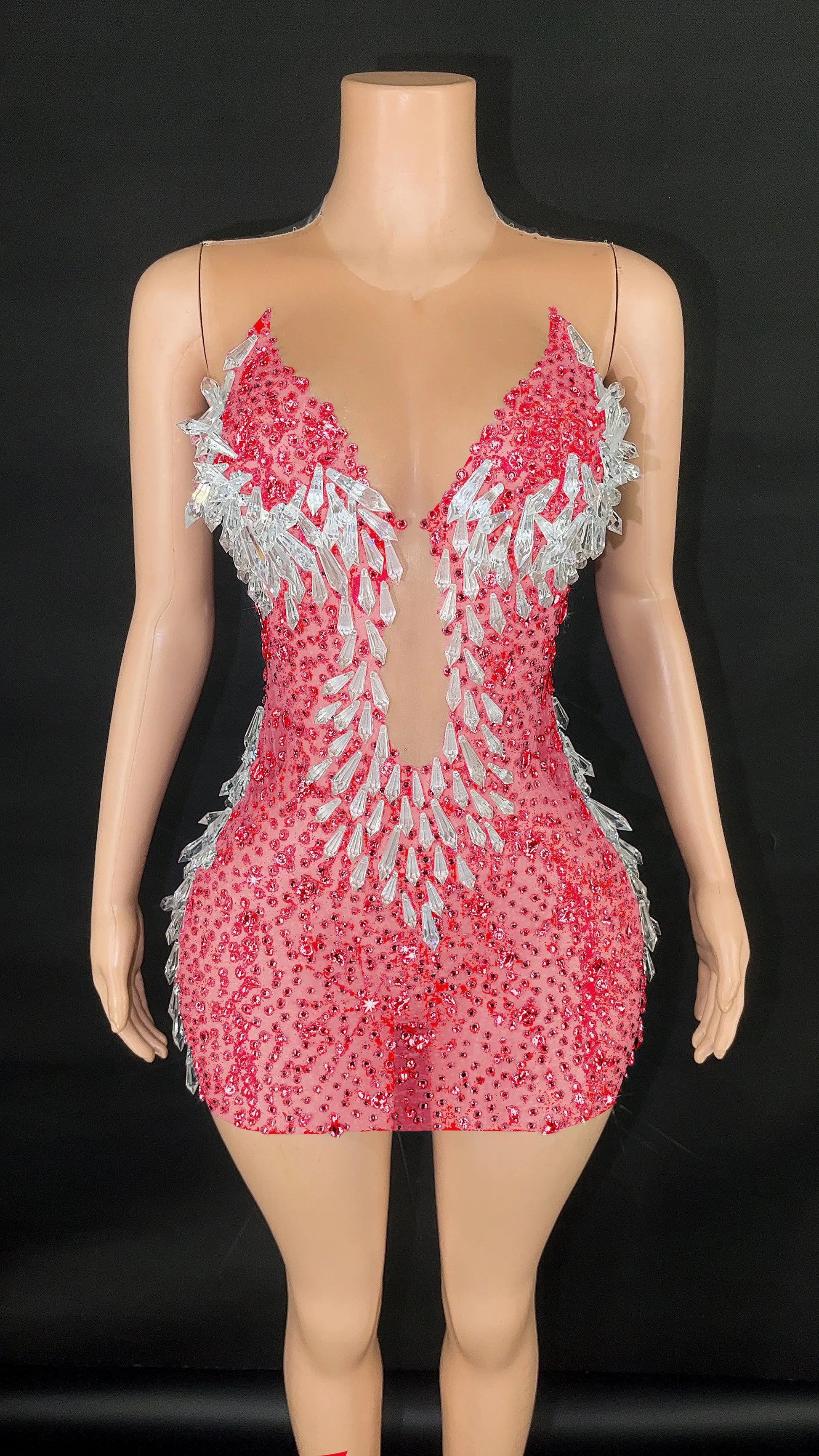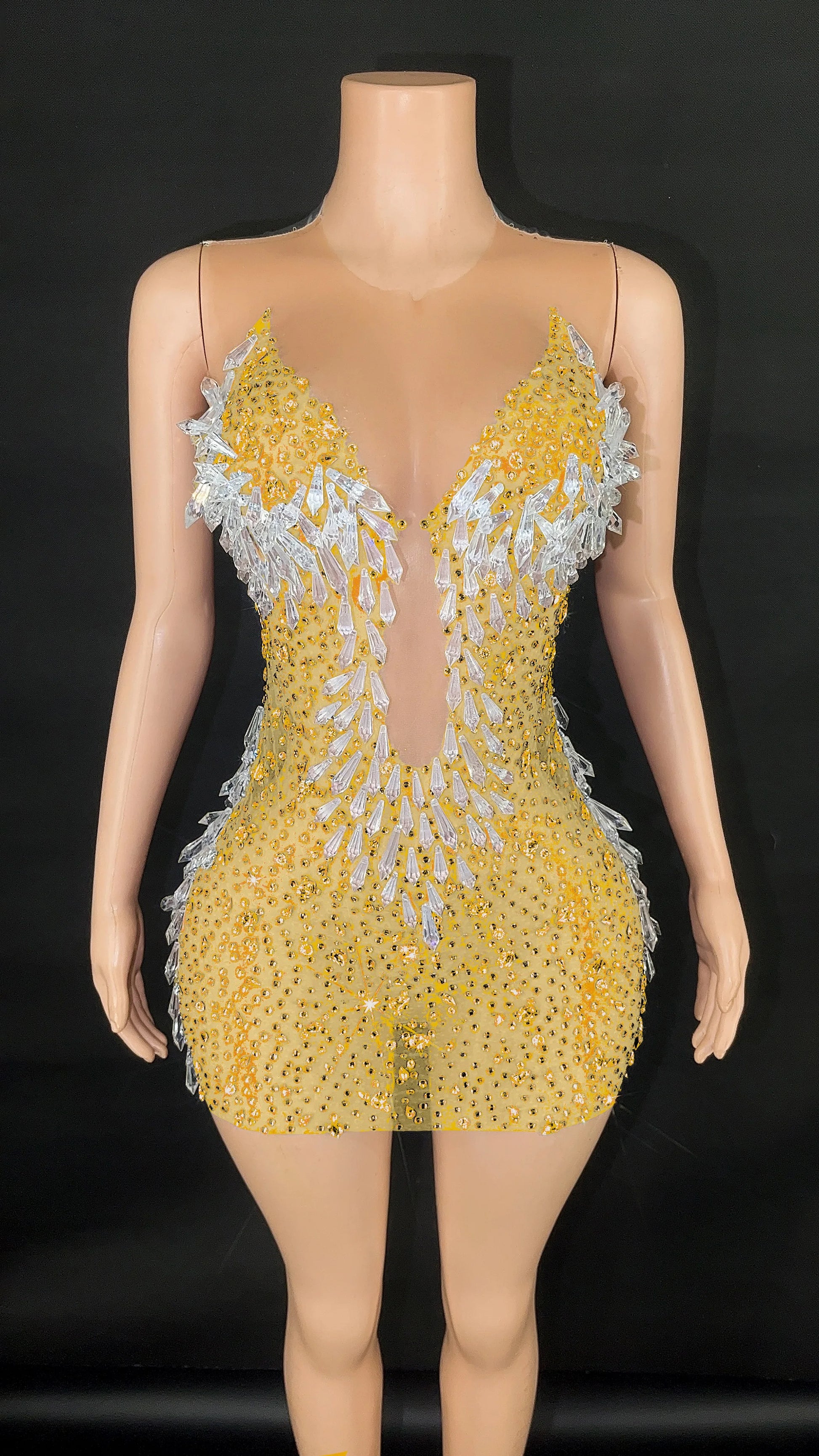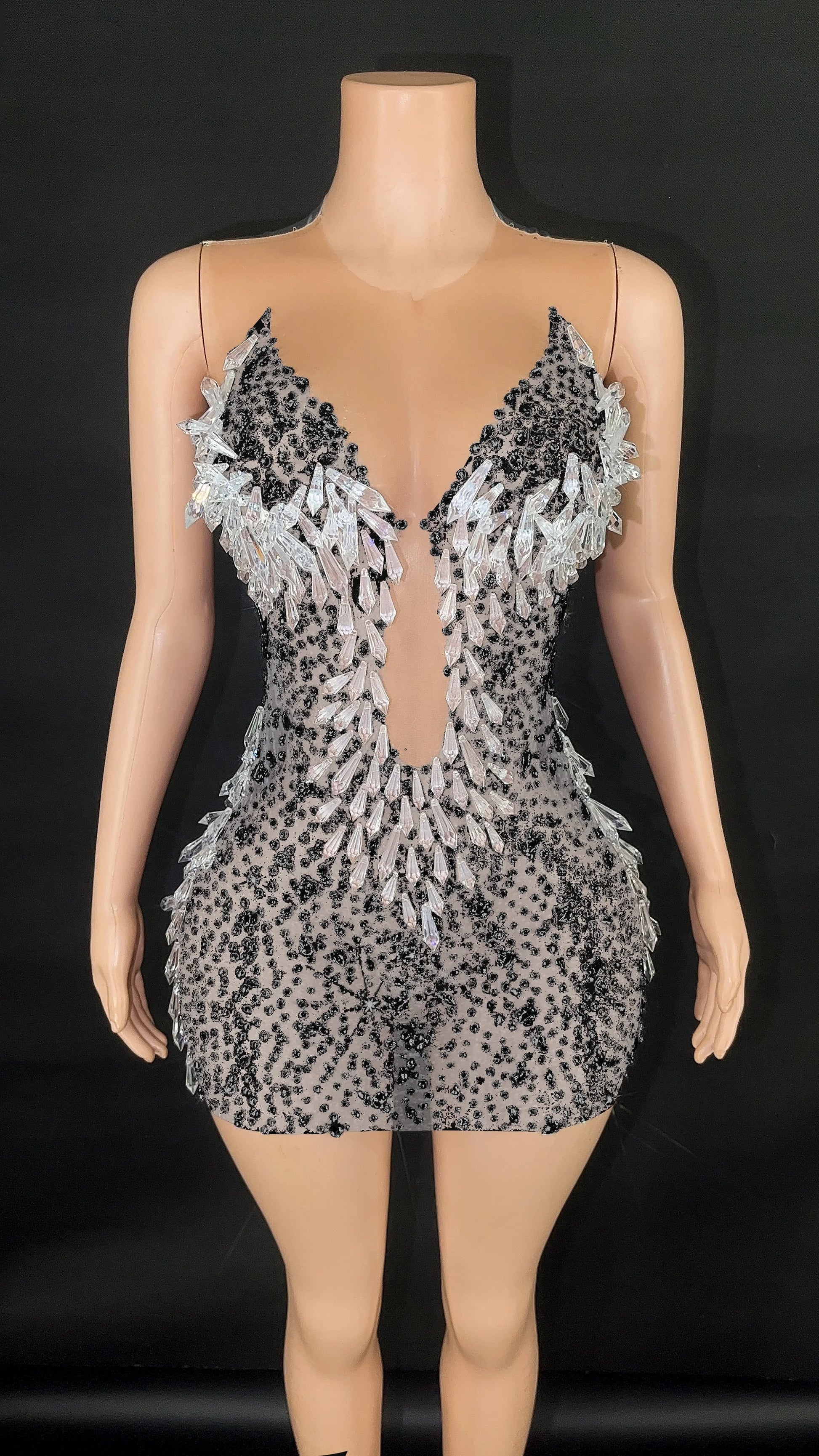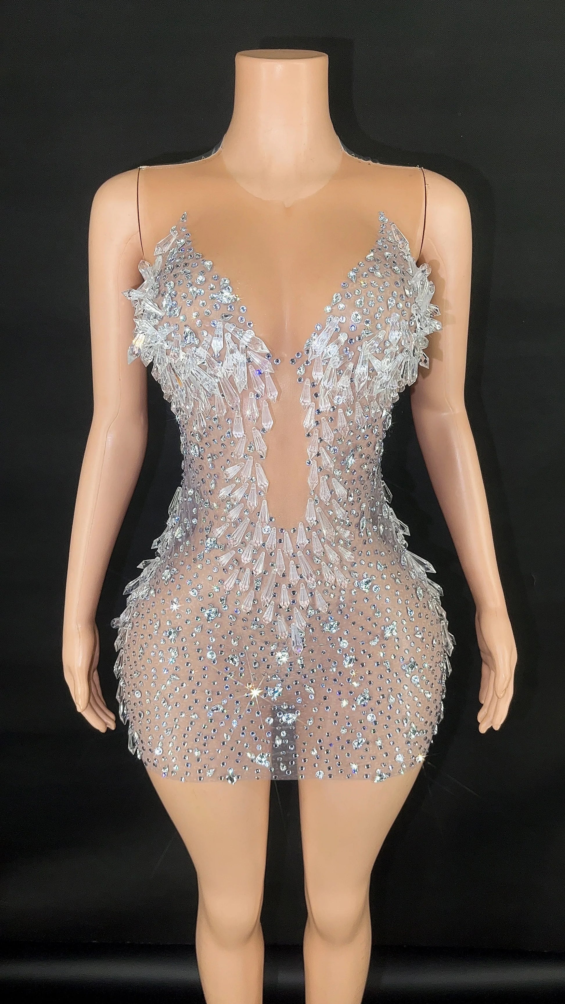 Make a dazzling entrance in this sparkly mesh short dress, adorned with rhinestone crystals for maximum shine. The sexy see-through design is perfect for women performing on stage, at parties, or in the nightclub. Elevate your stage presence with this bold and glamorous costume, designed to catch every light and command attention.
