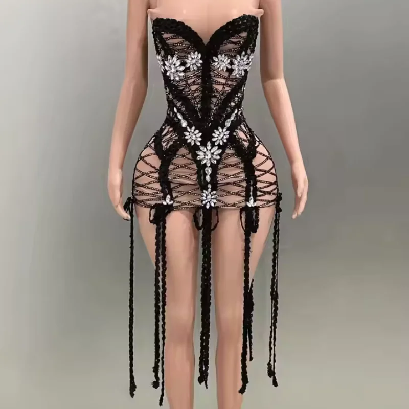 Radiate elegance and charm in this luxurious mini dress, featuring intricate embroidery and sparkling diamond accents. The halter neck design gracefully frames the shoulders, while long tassels add dramatic movement and flair. Perfect for red carpet events, stage performances, or any occasion where you want to capture goddess-like glamour, this dress is a statement piece that exudes sophistication and allure.